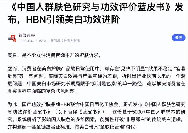 与此同时,基于这份蓝皮书,市面上出现大量“HBN引领美白进入‘全肤色管理’新时代”“打破传统美白认知”“HBN引领美白功效进阶”的相关文章,文章中的描述不乏“为中国人群肤色研究树立了首个‘真实世界美白标尺’”“在行业内引领性打造了‘全链路多维交叉验真体系’”等。