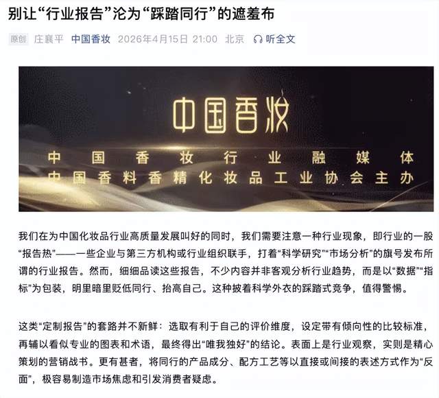 就在护家科技围绕蓝皮书展开密集宣传和产品售卖之际,中国香料香精化妆品工业协会在4月14日至15日连续发布两篇评论文章,对行业 “报告热” 乱象提出严肃批评。