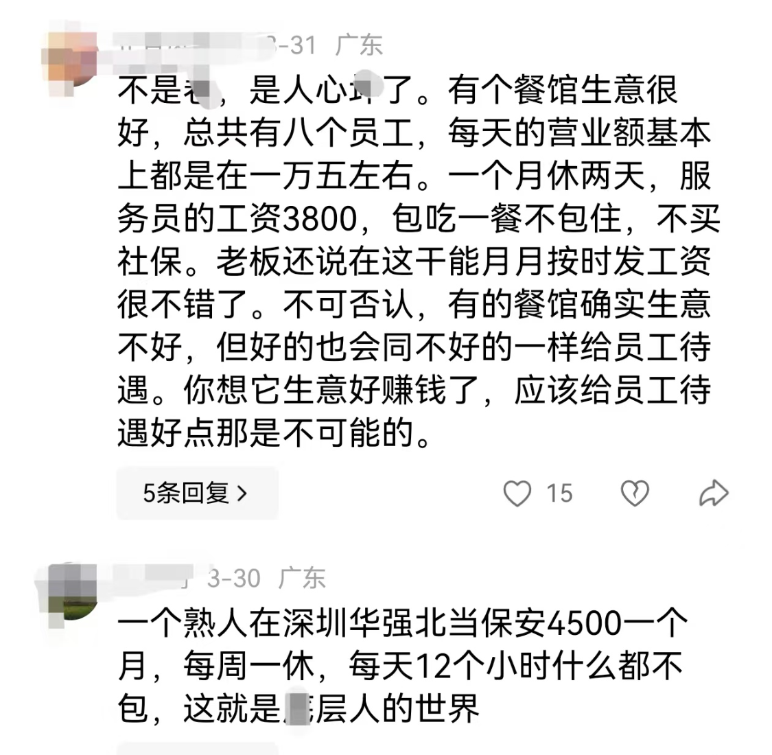 还有网友分享,一个熟人在深圳华强北当保安4500一个月,每周一休,很黄很黄的高潮口述每天12个小时什么都不包,这就是普通人的世界。