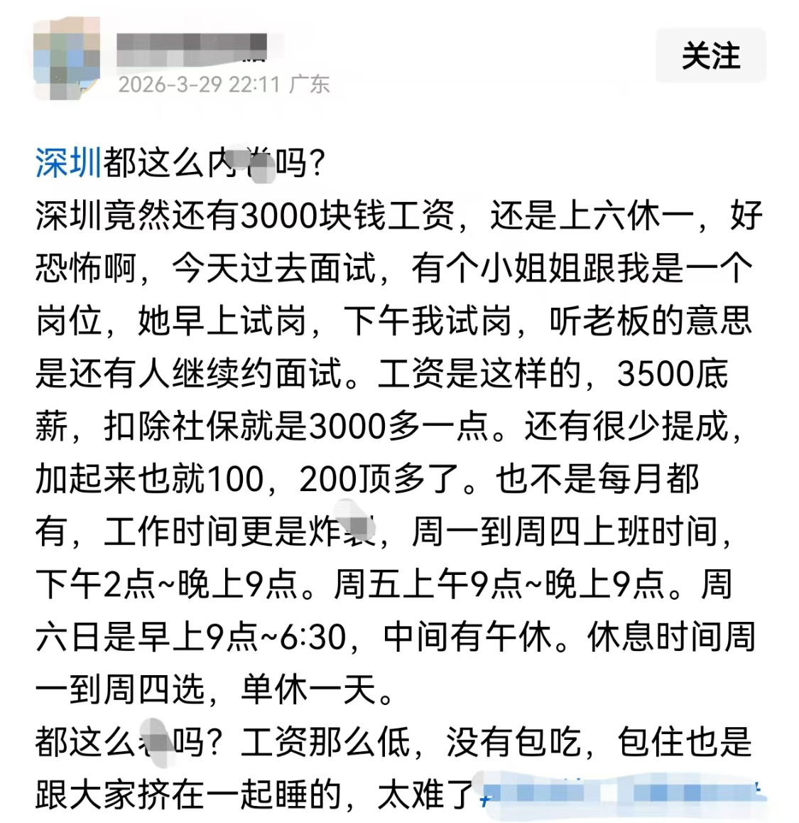 深圳竟然还有3000块钱工资,还是上六休一,好恐怖啊,今天过去面试,有个小姐姐跟我是一个岗位,她早上试岗,下午我试岗,听老板的意思是还有人继续约面试。工资是这样的,3500底薪,扣除社保就是3000多一点。还有很少提成,加起来也就100,200顶多了。也不是每月都有,工作时间更是Z裂,周一到周四上班时间,下午2点~晚上9点。周五上午9点~晚上9点。周六日是早上9点~6:30,中间有午休。休息时间周一到周四选,单休一天。