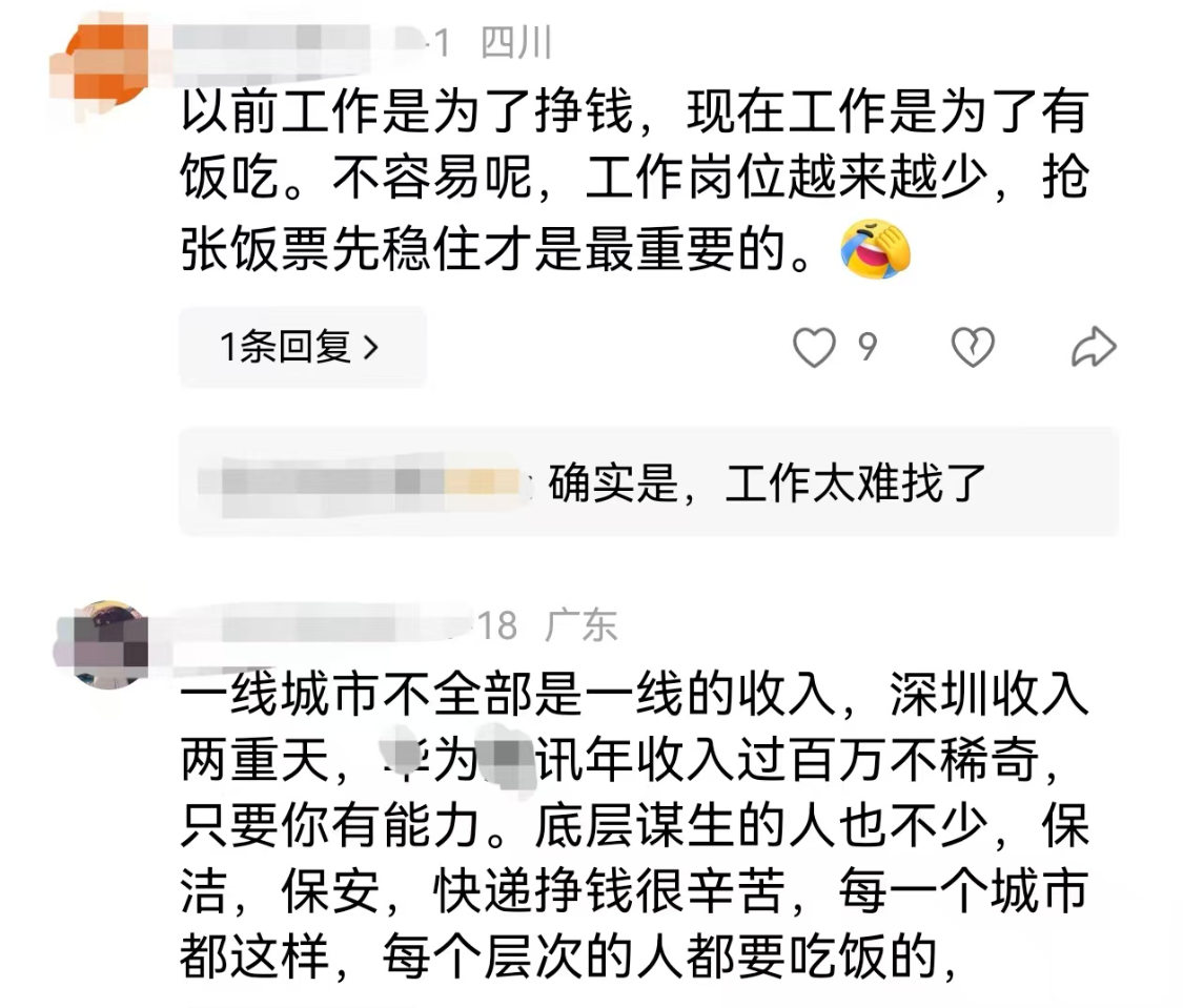 还有网友说,一线城市不全部是一线的收入,深圳收入两重天,某为某讯年收入过百万不稀奇,只要你有能力。底层谋生的人也不少,保洁,保安,快递挣钱很辛苦,每一个城市都这样,每个层次的人都要吃饭的。